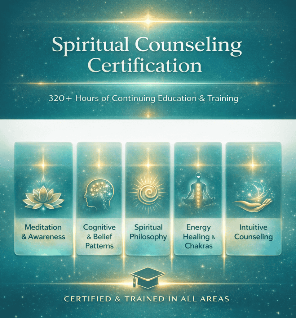 300+ hours of continuing education across meditation, belief systems, spiritual philosophy, energy awareness, and counseling frameworks.